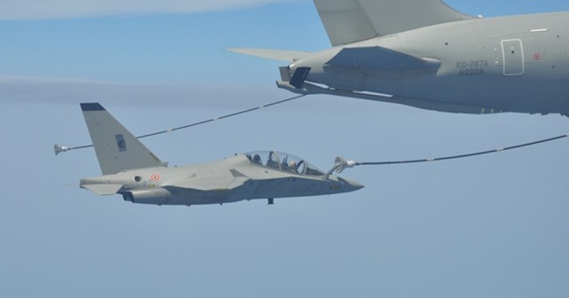 LetalstvoNovice Prva oskrba italijanskega trenažnega letala M-346 z gorivom v zraku by Urednik 06/07/2016 06/07/2016 ITALIJANSKI PILOTI INŠTRUKTORJI PREIZKUSILI LETALO M-346 PRI OSKRBI Z GORIVOM V ZRAKU Italijanske letalske sile (Aeronautica Militare) so uspešno izvedle prvo oskrbo trenažnih letal Alenia Aermacchi T-346A (M-346) in Aermacchi FT-339 (MB-339) iz leteče cisterne Boeing KC-767A. Oskrba z gorivom v zraku je bila izvedena med trenažnim poletom šolskih letal iz 61. polka, ki domuje v letalski bazi Lecce Galatina, in letečih tankerjev iz 14. polka iz letalske baze Pratica di Mare (v bližini Rima). To je bila sploh prva zračna oskrba z gorivom (AAR – air-to-air refuelling) za nove (od avgusta 2015) italijanske trenažerje M-346 (italijanska vojaška oznaka: T-346A), kot tudi prva oskrba iz leteče cisterne KC-767A za starejše trenažerje MB-339 (italijanska vojaška oznaka: FT-339). V “operaciji oskrbe z gorivom v zraku” so sodelovali vojaški piloti – inštruktorji iz 212. eskadrilje 61. letalskega polka, ki ima nalogo usposabljanja pilotov za letenje s taktičnimi bojnimi letali (Eurofighter typhoon, F-35, Panavia tornado, AMX). Italijanske letalske sile imajo od leta 2011 v svoji floti 4 leteče cisterne Boeing KC-767A, ob tem pa že vrsto let tudi 6 letečih tankerjev Boeing KC-130J. Italijanski bojni piloti prešolanje na lovska letala opravljajo na trenažnih letalih MB-339 (skupaj 81 letal) in od avgusta 2015 tudi na 5-ih najsodobnejših jurišno-trenažnih letalih Alenia Aermacchi M-346 master (naročenih še 13), ki omogočajo prešolanje na bojna letala 5. generacije (F-35). Italijanska vojska bo z letali M-346 v naslednjih letih zamenjala celotno floto šolskih letal MB-339. Za leto 2017 so napovedali dobavo novih letal M-346 tudi vojaški akrobatski letalski skupini Frecce Tricolori, ki sedaj leti z MB-339. Pripravil: A. Knific, foto: YouTube Delite novico:FacebookTwitterMorePrintPinterestTumblrLinkedInRedditPocket EvropagorivoItalijaKC-767leteči tankerM-346MB-339oskrba z gorivom v zrakutrenažno letalo Povezani članki 33. SREČANJE S PRETEKLOSTJO – mednarodni sejem militarij... 07/11/2024 Italijani so odobrili nakup najnovejšega tanka leoparda 2 14/03/2024 Bližajoča se velika ofenzivo ruskih oboroženih sil? 12/03/2024 Novo češko topovsko orožje – v ozadju pogodba... 11/03/2024 Andrzej Duda: »Predlagal bom, da članice zavezništva za... 11/03/2024 VIDEO: Prvi uničeni ukrajinski HIMARS 07/03/2024 Najsodobnejši ruski tank T-14 armata ne gre na... 07/03/2024 Rusija lahko dopolni svojo floto letal AWACS z... 06/03/2024 Izjava nemškega obrambnega ministra o »klepetu« o manevrirnih... 05/03/2024 Sestreljeno še drugo rusko letalo A-50 25/02/2024
